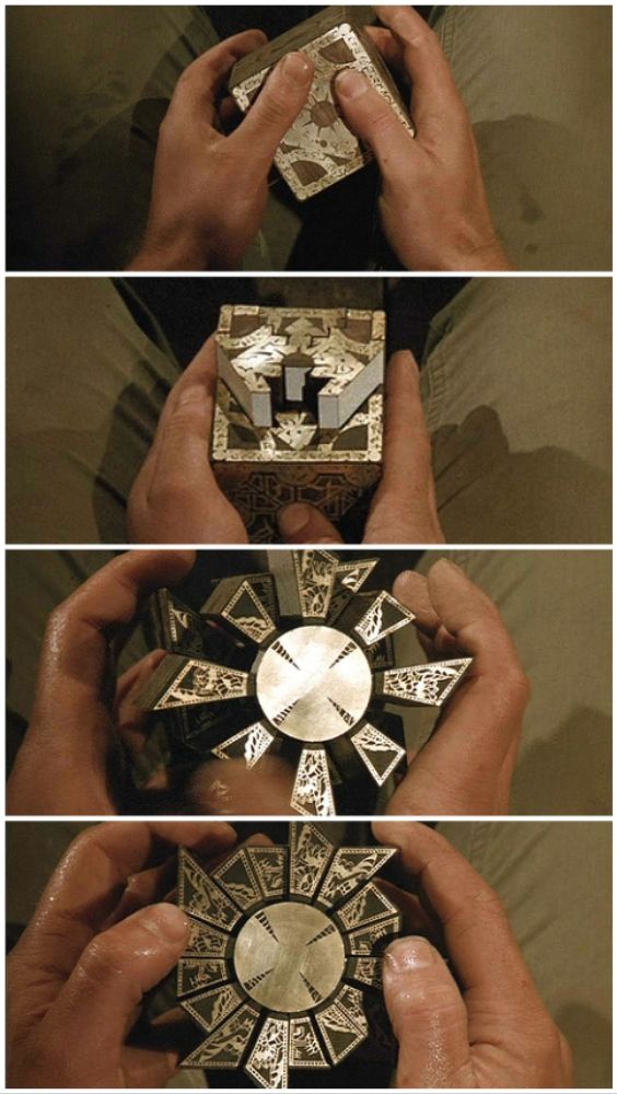 A Puzzle Box or LeMarchand Box, is a fictional lock puzzle or puzzle box created by the fictional antagonist Philip LeMarchand, an 18th Century French architect, artisan and designer of some infamy. He first created his designs as bizarre, intricately designed music boxes, as he was well known as a maker of mechanical singing birds. But as a devotee of the occult, he became obsessed with the supernatural which directly influenced the creation of the first puzzle box, known as the 'Lament Configuration' or "The Box of Sorrows". When solved, a dolorous bell can be heard tolling, as if from a distance, announcing the arrival of the Cenobites, extra dimensional beings that serve the lord and master of Hell - Leviathan.